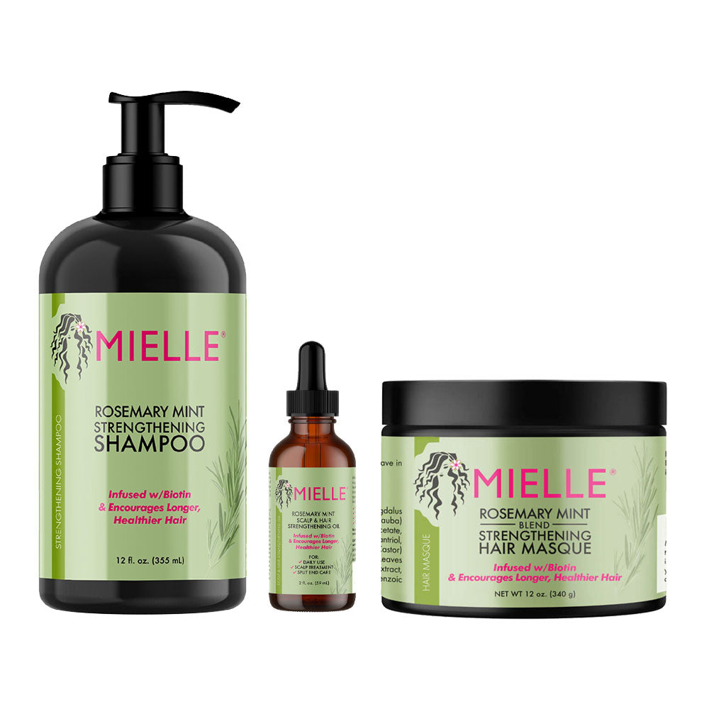 Revive your hair from root to tip with the Mielle Rosemary Mint Repair & Strength Bundle. This powerful trio is infused with biotin and certified organic ingredients like rosemary, mint, coconut oil, and babassu oil to nourish, strengthen, and stimulate healthy hair growth.